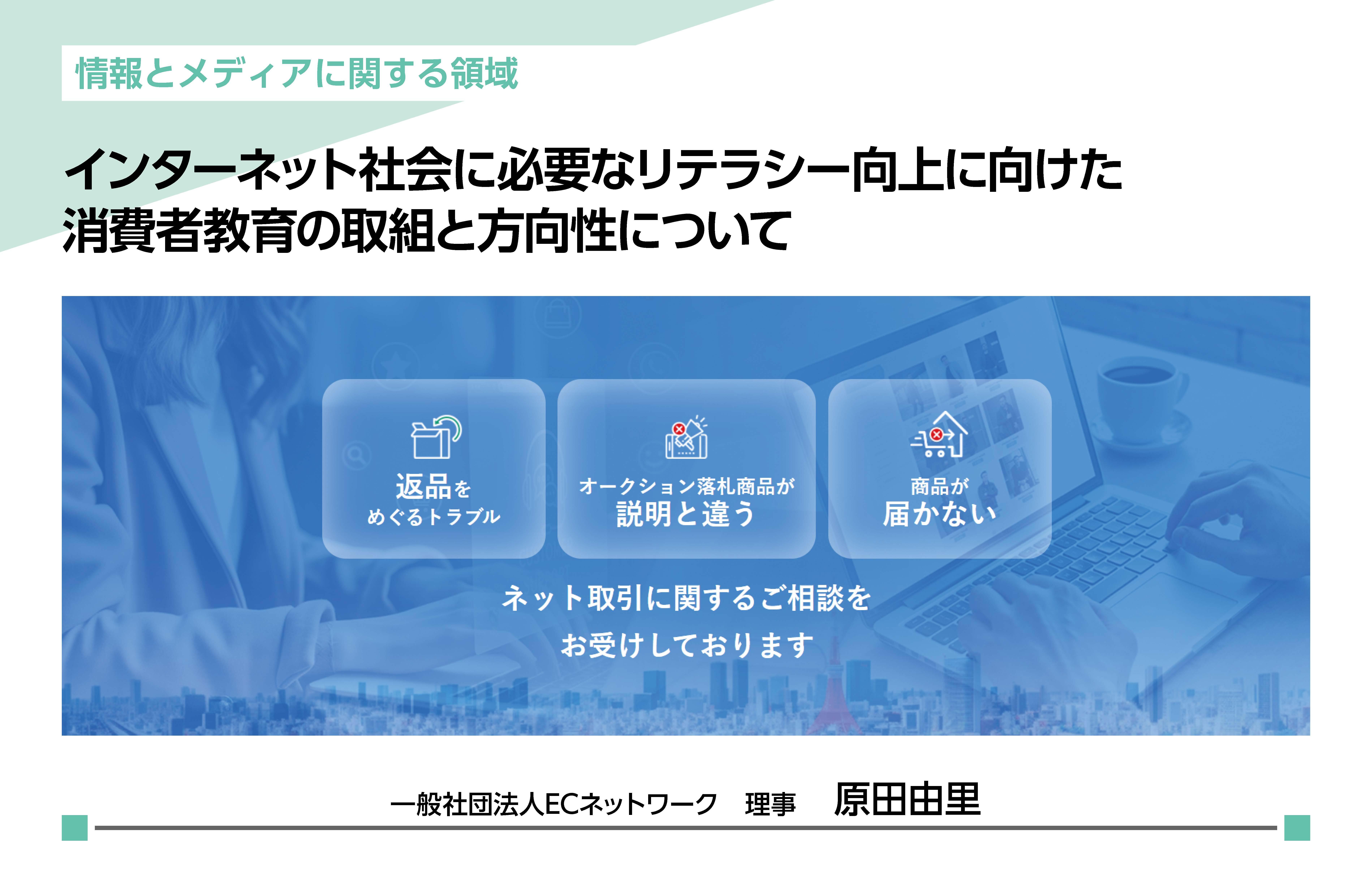 一般社団法人ECネットワーク(以下、(一社)ECネットワークといいます。)は、安全で安心な電子商取引の推進を目的に2006年に設立された組織です。消費者に対するオンラインでの相談対応や事業者への助言、法制度への提言、消費生活センター、同センター相談員からの相談対応など幅広い活動を通じて、誰もが安心してデジタル社会に参加できる環境づくりを進めています。設立以来一貫してインターネット社会と消費者問題に向き合ってきた同団体理事原田由里様に、デジタル社会における消費者トラブルの現状や、リテラシー向上のために求められる消費者教育について伺いました。
