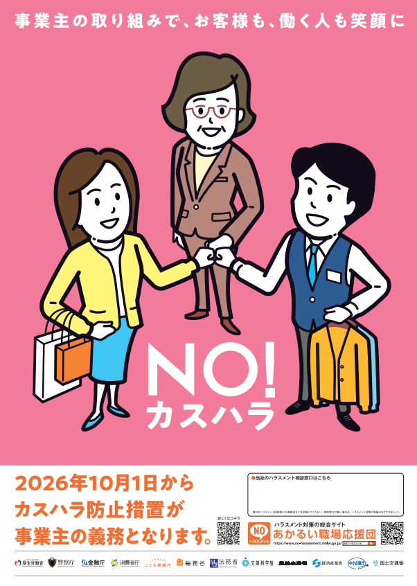 NO!カスハラ 事業主の取り組みで、お客様も、働く人も笑顔に【厚生労働省・警察庁・金融庁・消費者庁等12省庁】